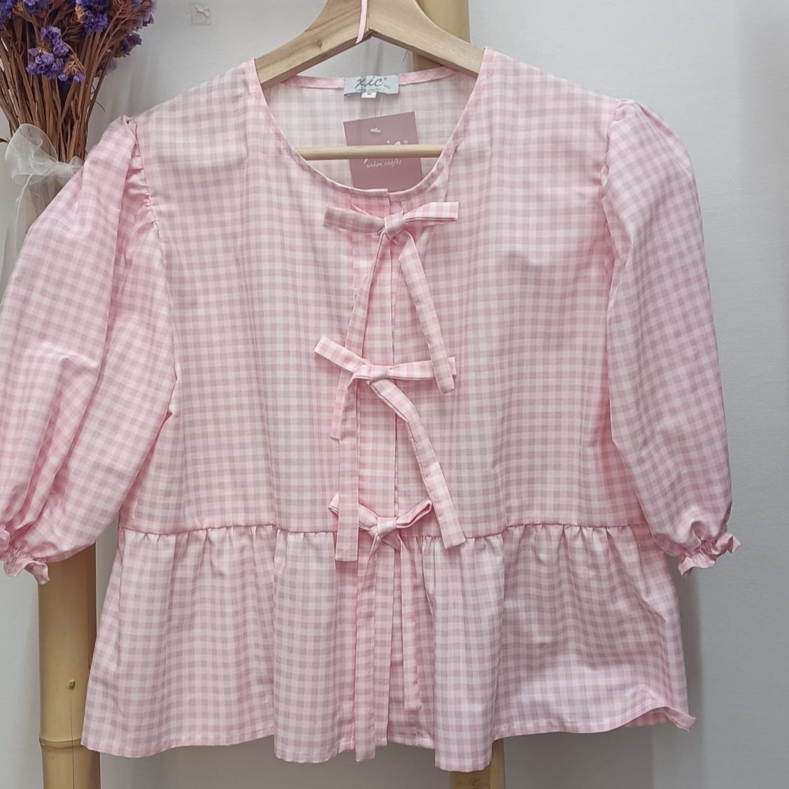 Blusa Laços Rosinha confecionado em tecido 100% algodão, fecha na frente com laços, manga curta em balão. Ideal para completar o matchy com os filhos.