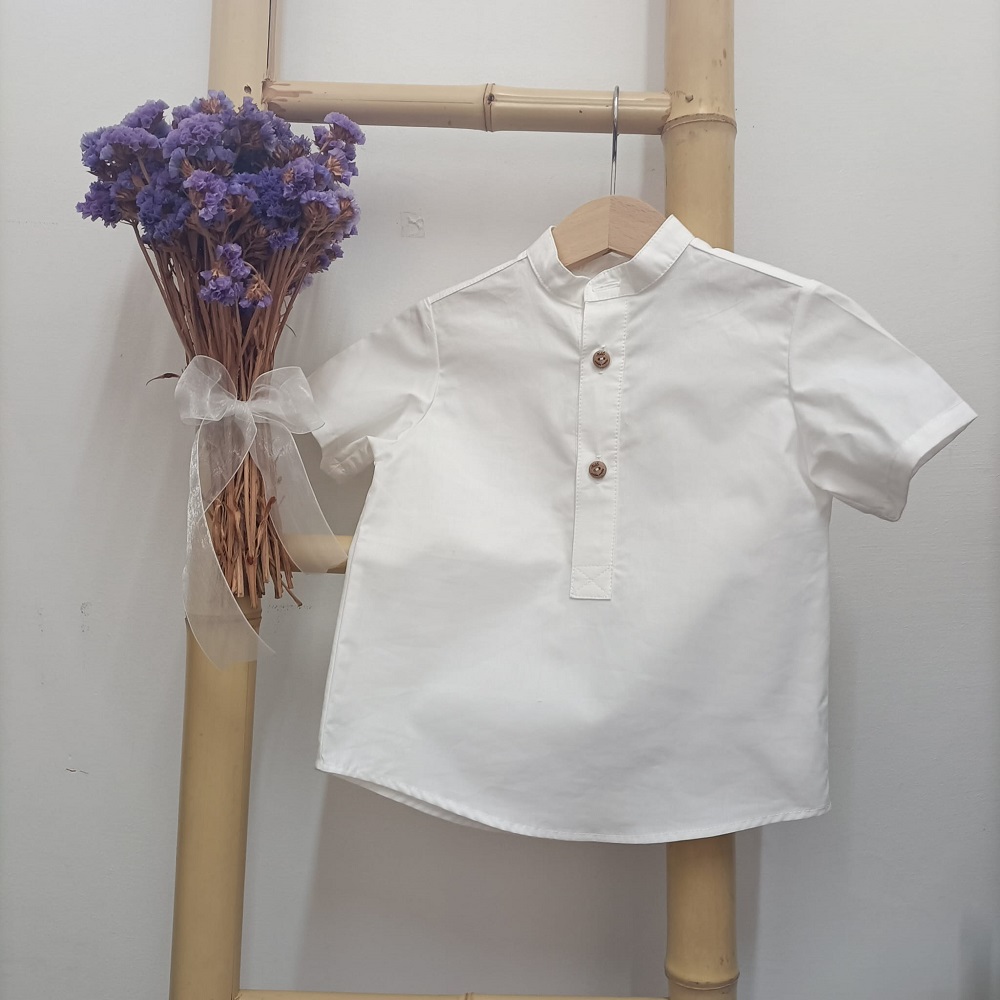 Camisa Gola Padre, em algodão, manga curta. Frente com abertura parcial, fecha com botão de madeira. Ideal para todas as ocasiões especiais.