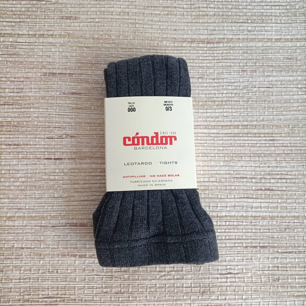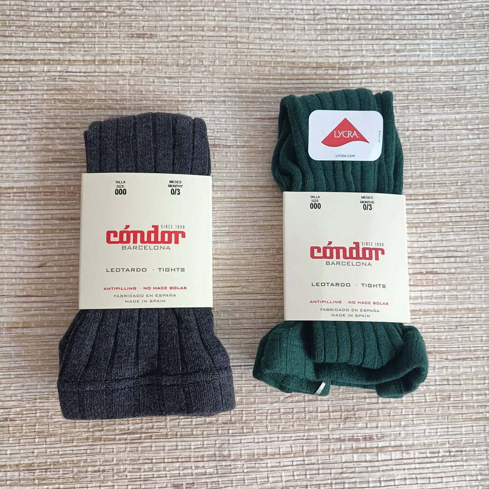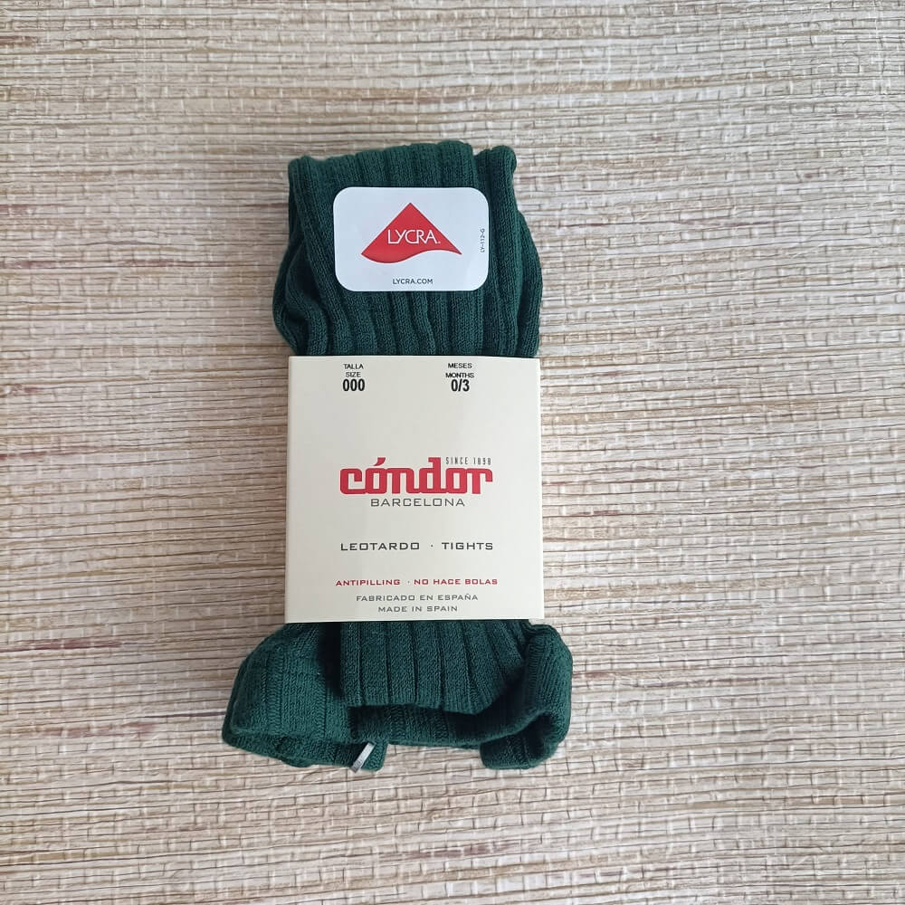 Collant Canelado Condór verde garrafa e cinza escuro, composto por 75% algodão, 22% poliamida e 3% elastano. Ideal para os mais pequenos sem criar borboto.