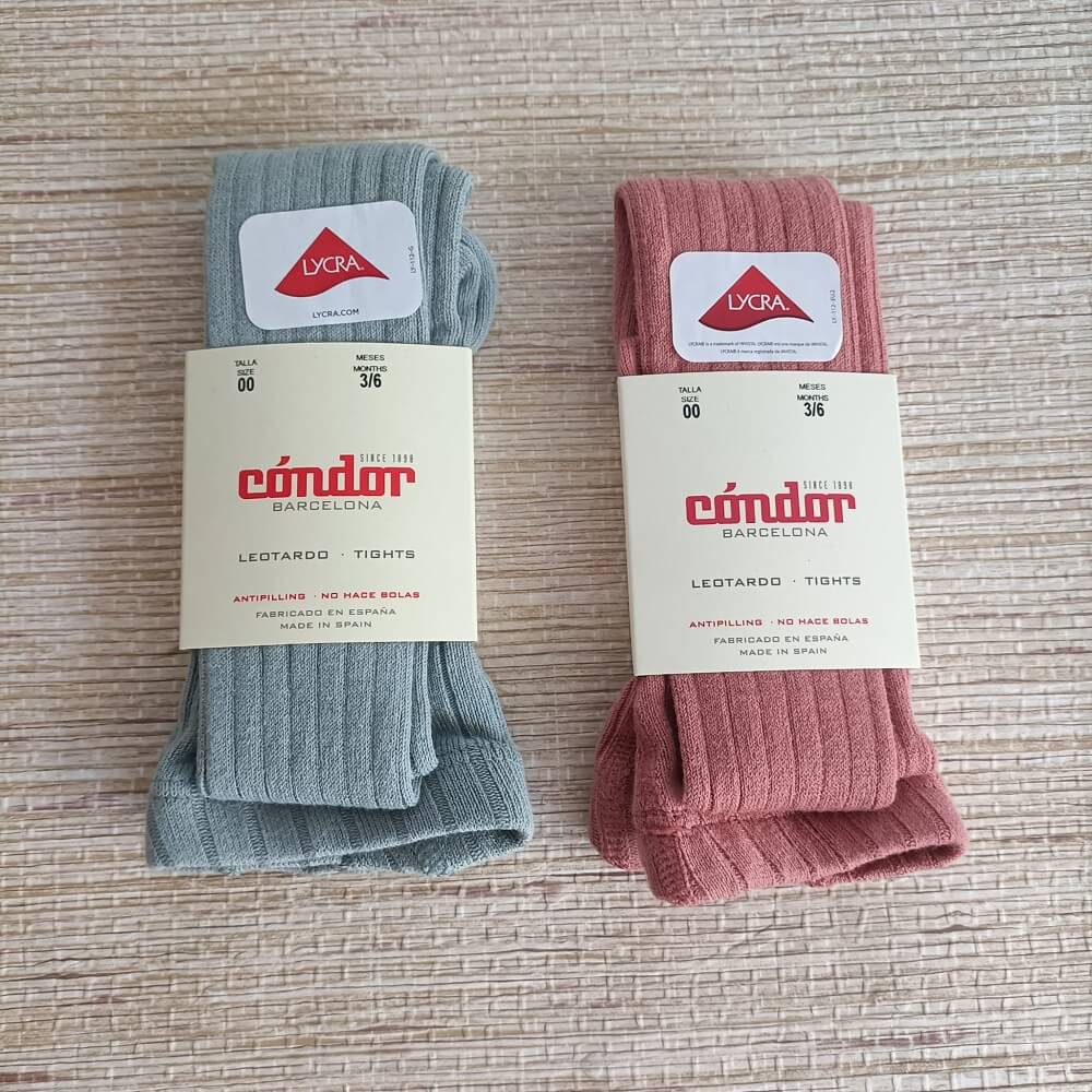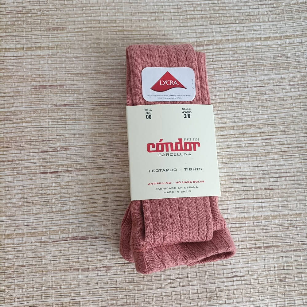 Collant Canelado Condór rosa escuro e cinza esverdeado, composto por 75% algodão, 22% poliamida e 3% elastano. Ideal para os mais pequenos sem criar borboto.