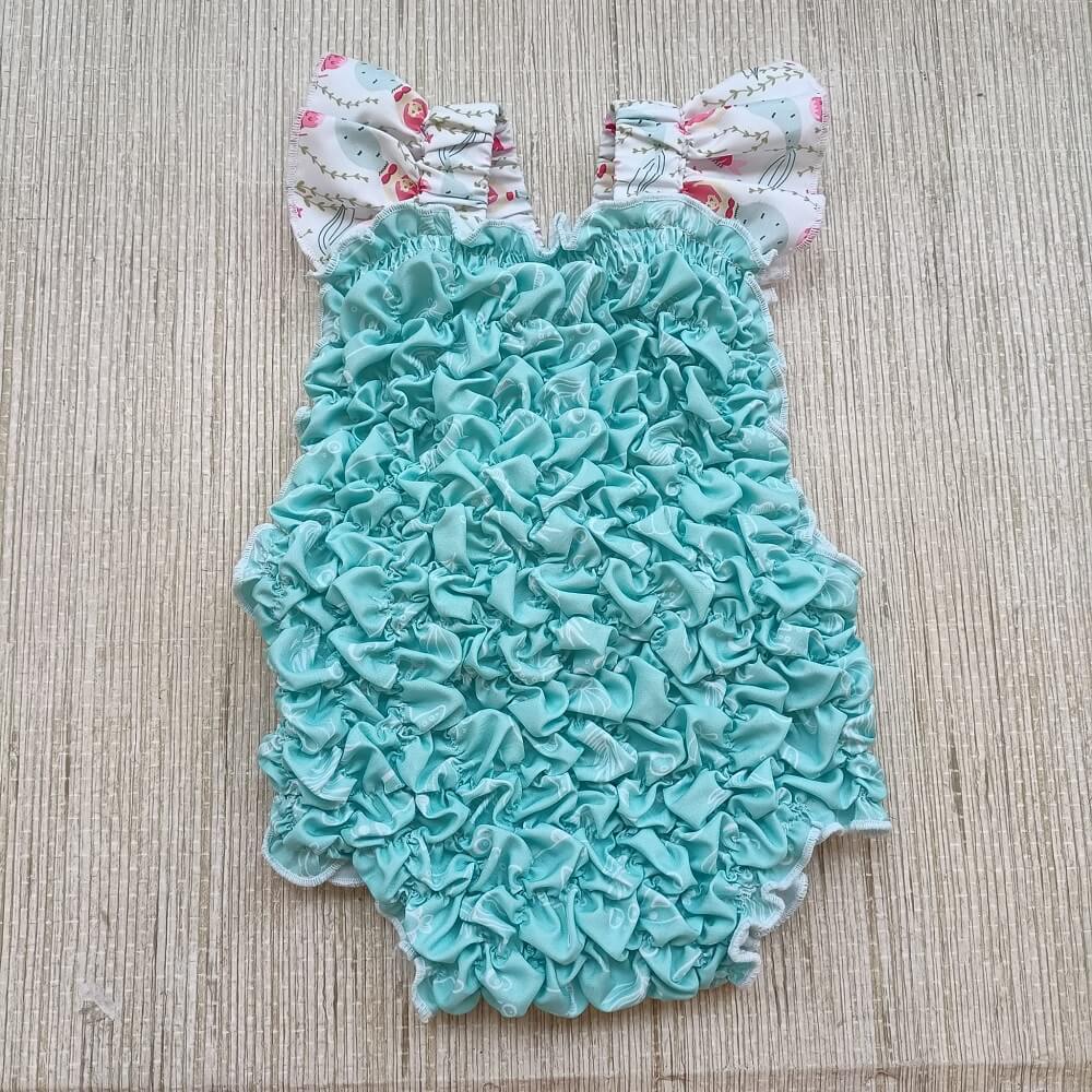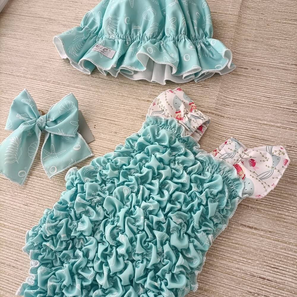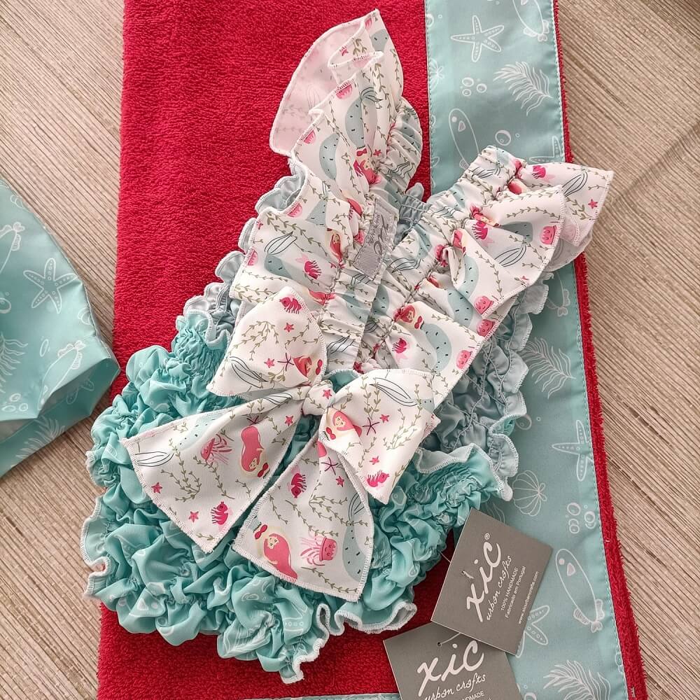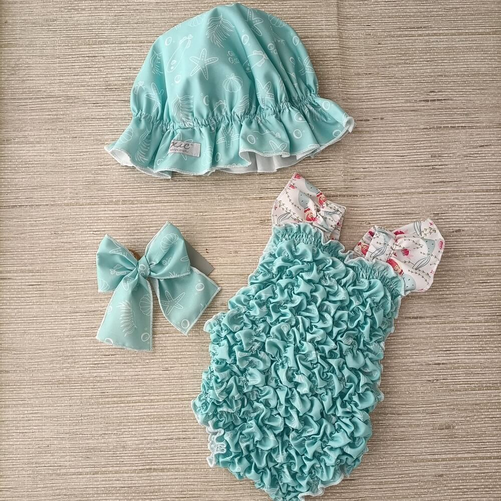 Fato de banho Favos Azul confecionado em tecido 100% poliéster que permite a rápida secagem do tecido, com folho nas alças e laço nas costas, confecionado com elásticos permitindo o máximo conforto do bebé sempre em grande estilo.