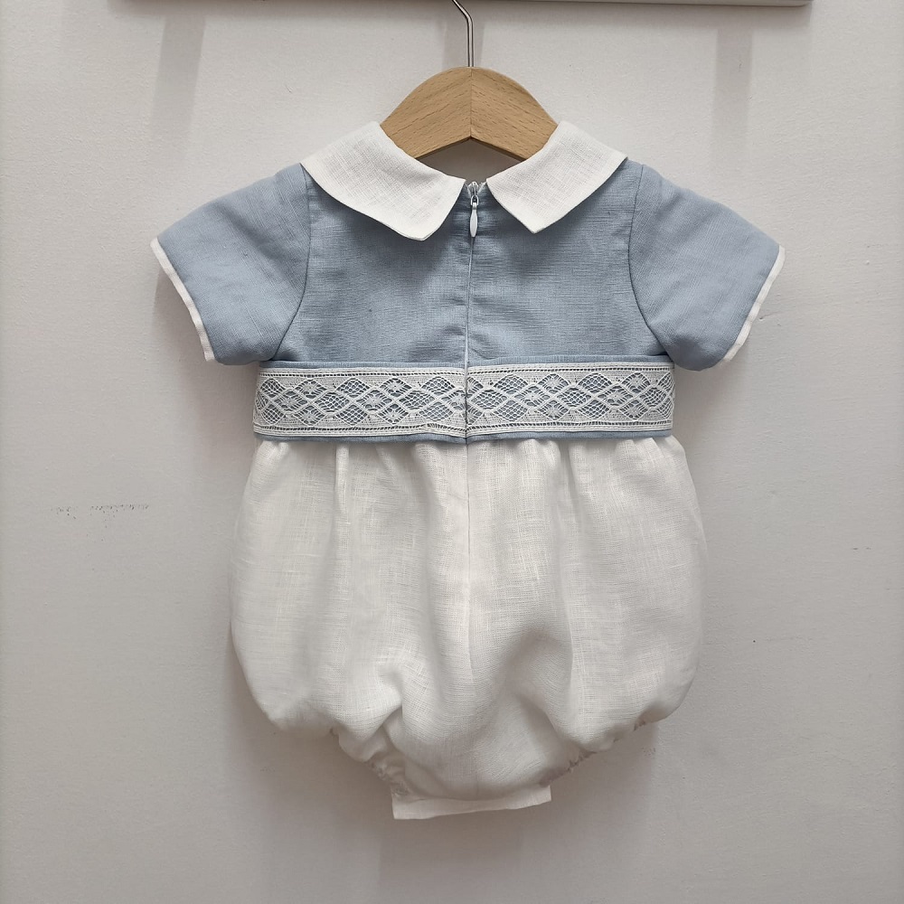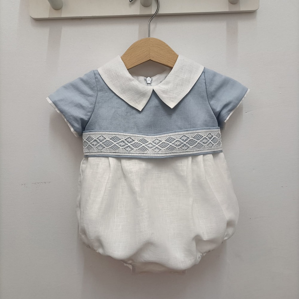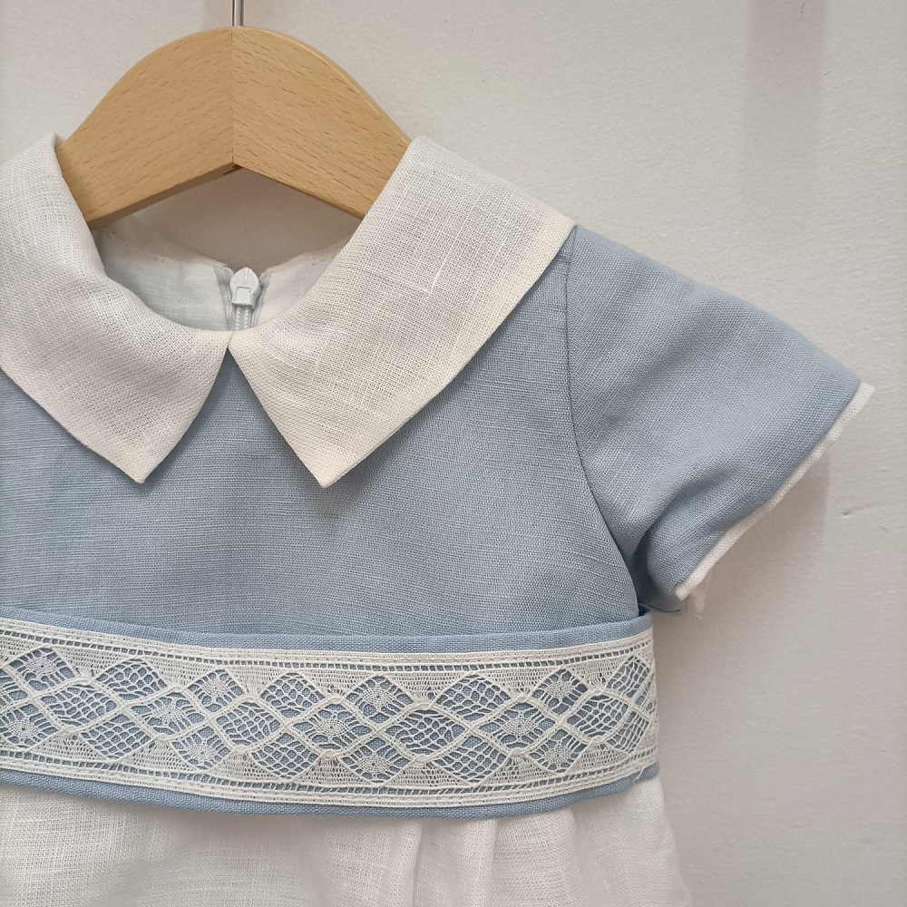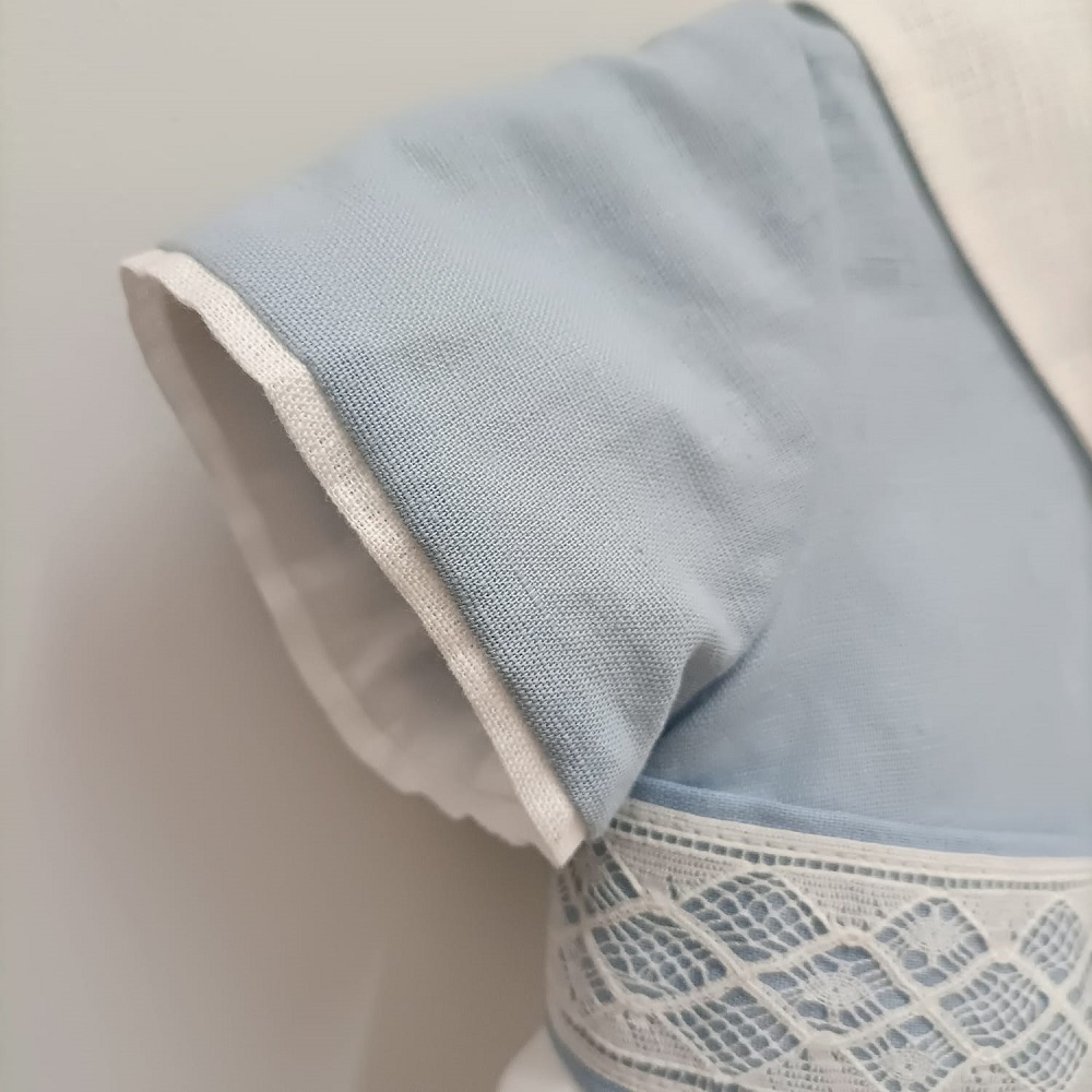 Fofo Cerimónia D. Duarte confecionado em tecido 100% linho. Gola em bico. Faixa lisa com aplique de renda. Com fecho para facilitar o vestir/despir e aperta no meio das pernas com botão de madeira.