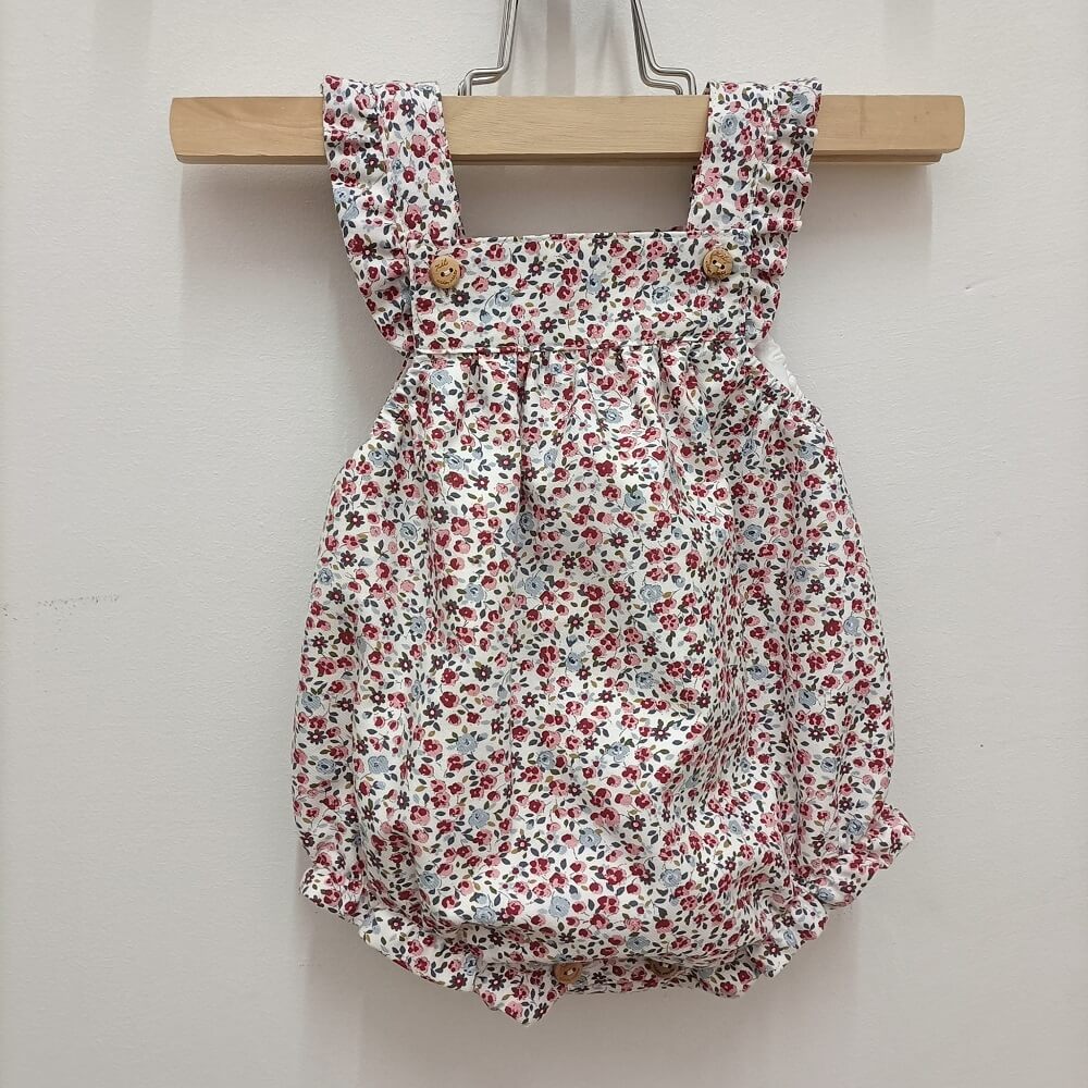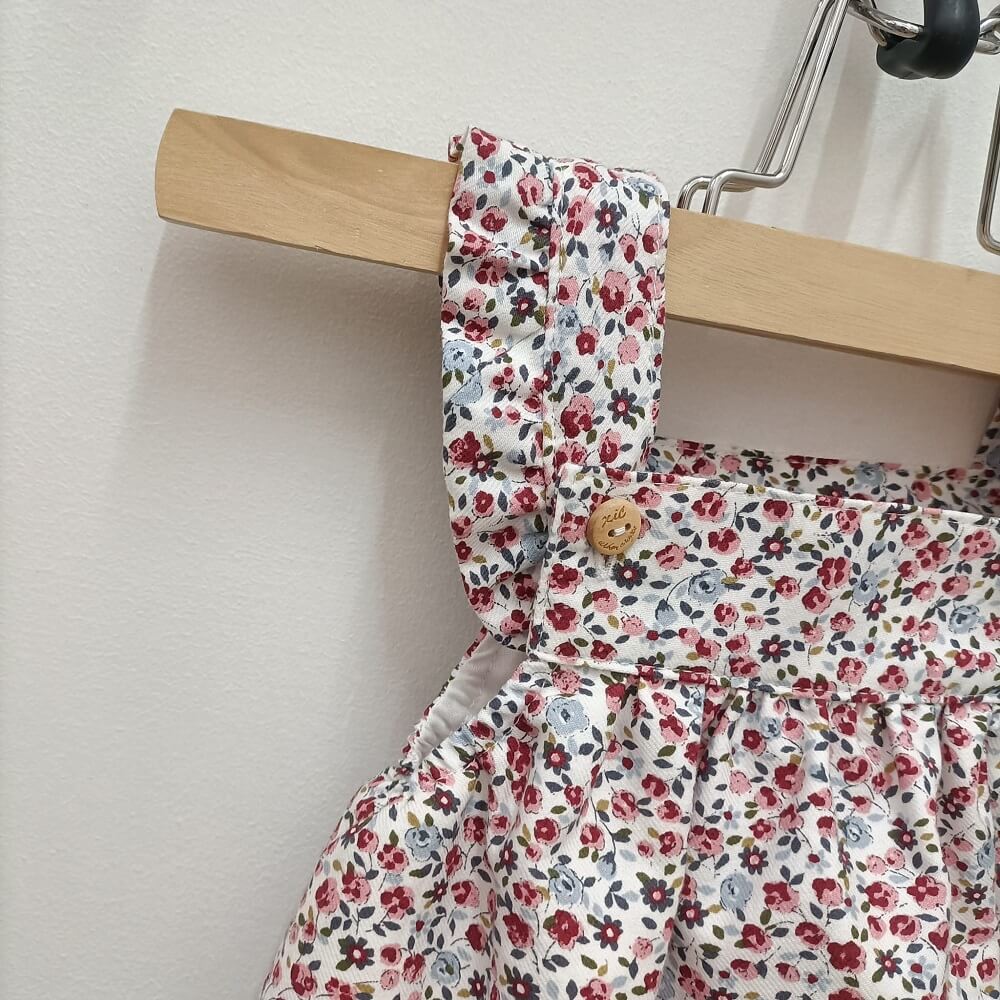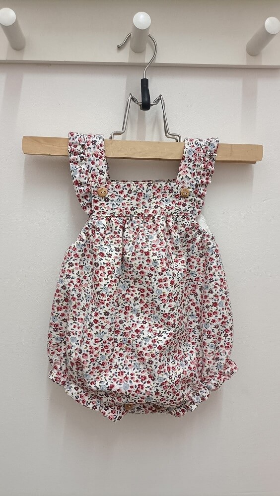 Fofo Concha confecionado em tecido 100% algodão com botão de madeira nas alças e botão entre as pernas para facilitar a atividade vestir/despir.