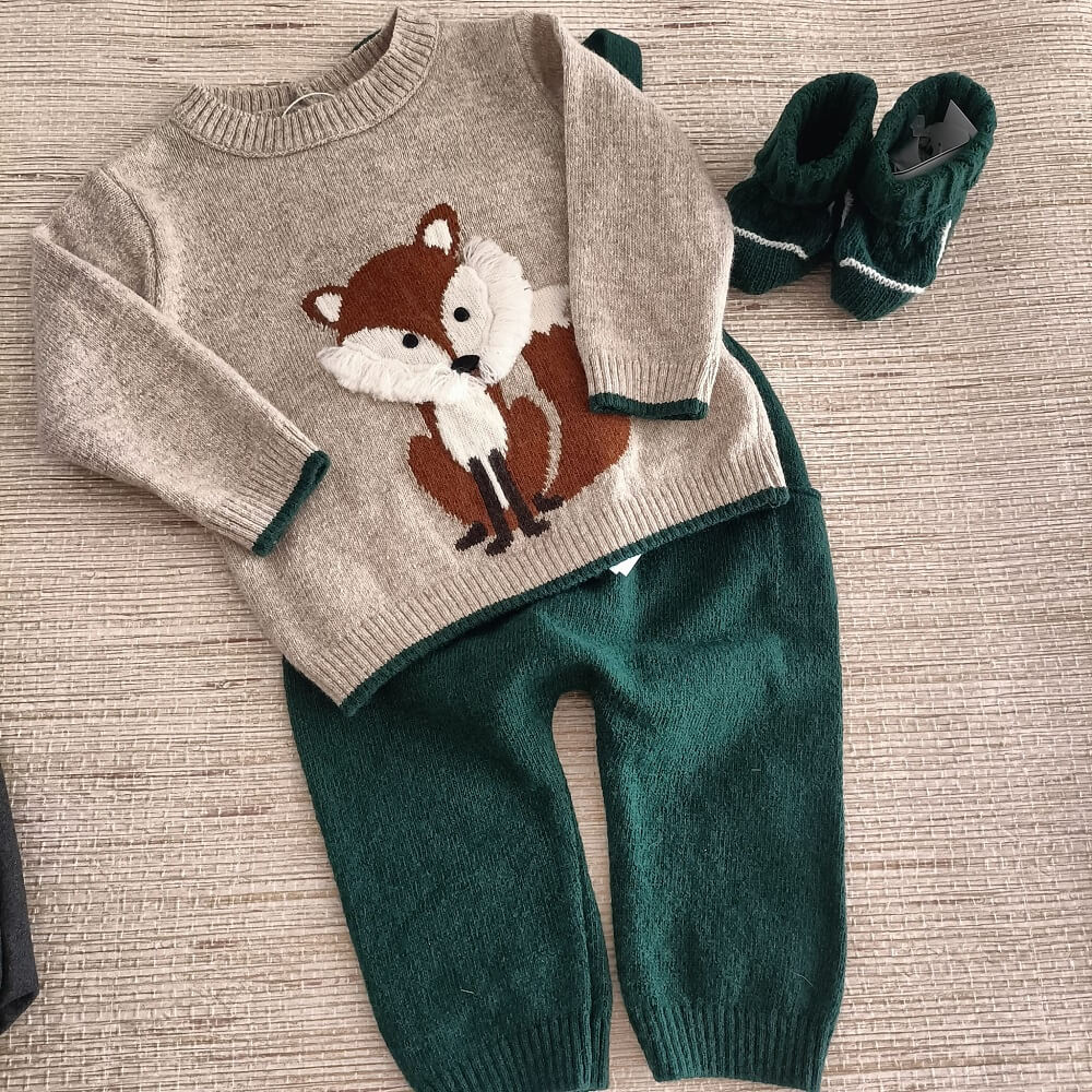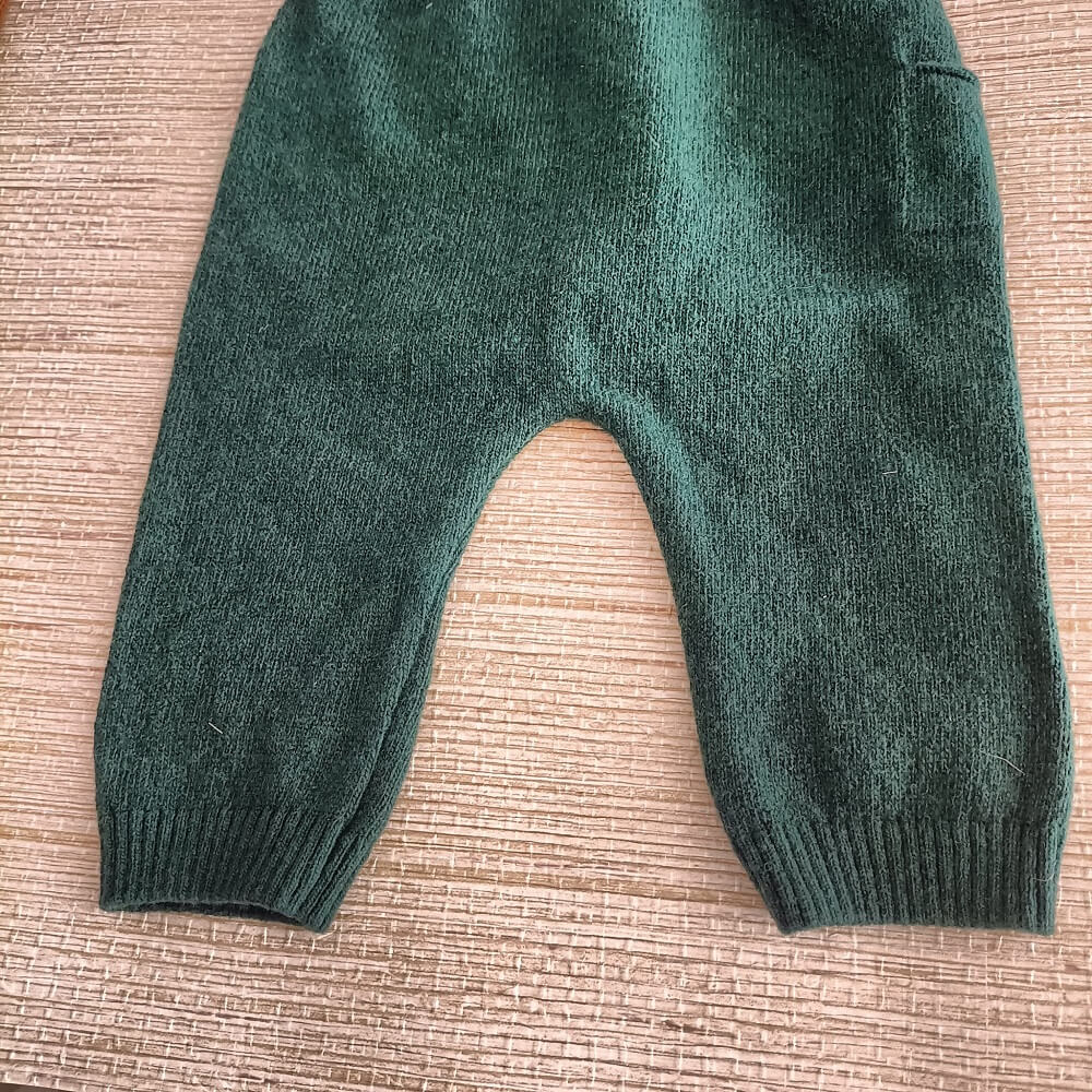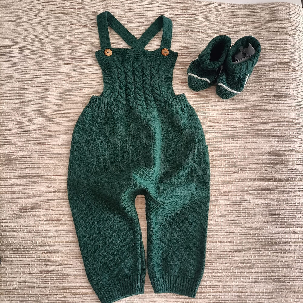 Jardineira bebé Verde confecionada em tecido 40% lã, 40% algodão e 20% poliamida. Alças cruzam nas costas e apertam à frente com botão de madeira. Pormenor entrançado na zona do peito. Ideal para completar a coleção raposinha.