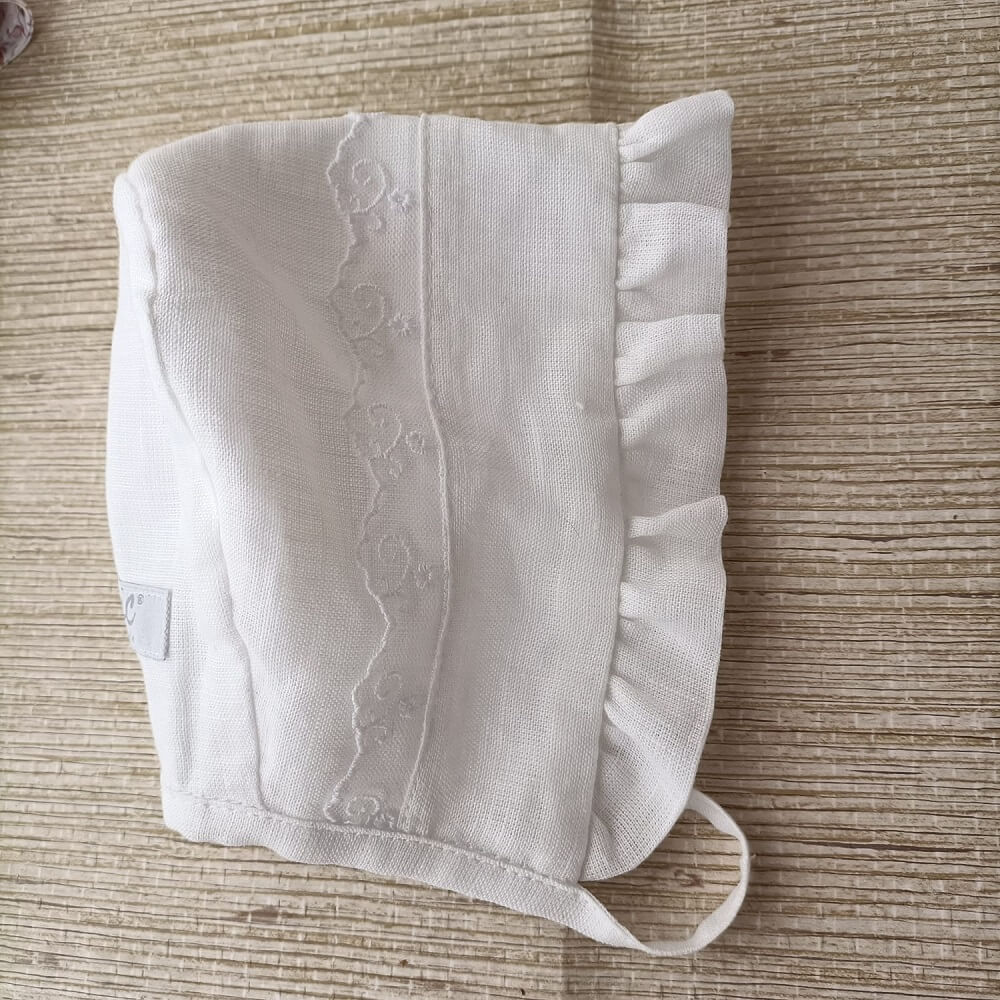 Touca de Cerimónia em tecido 100% linho e aplicação de folho e renda. A peça ideal para completa o look do seu bebé.