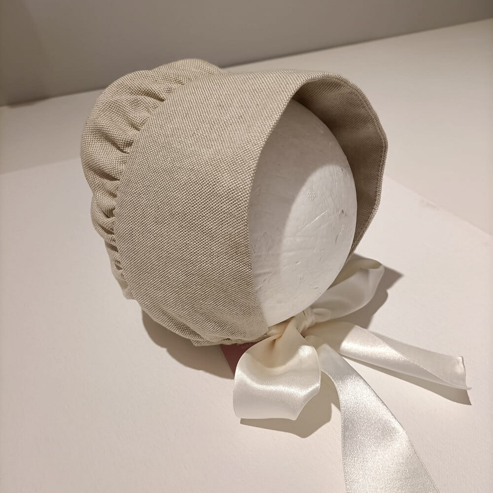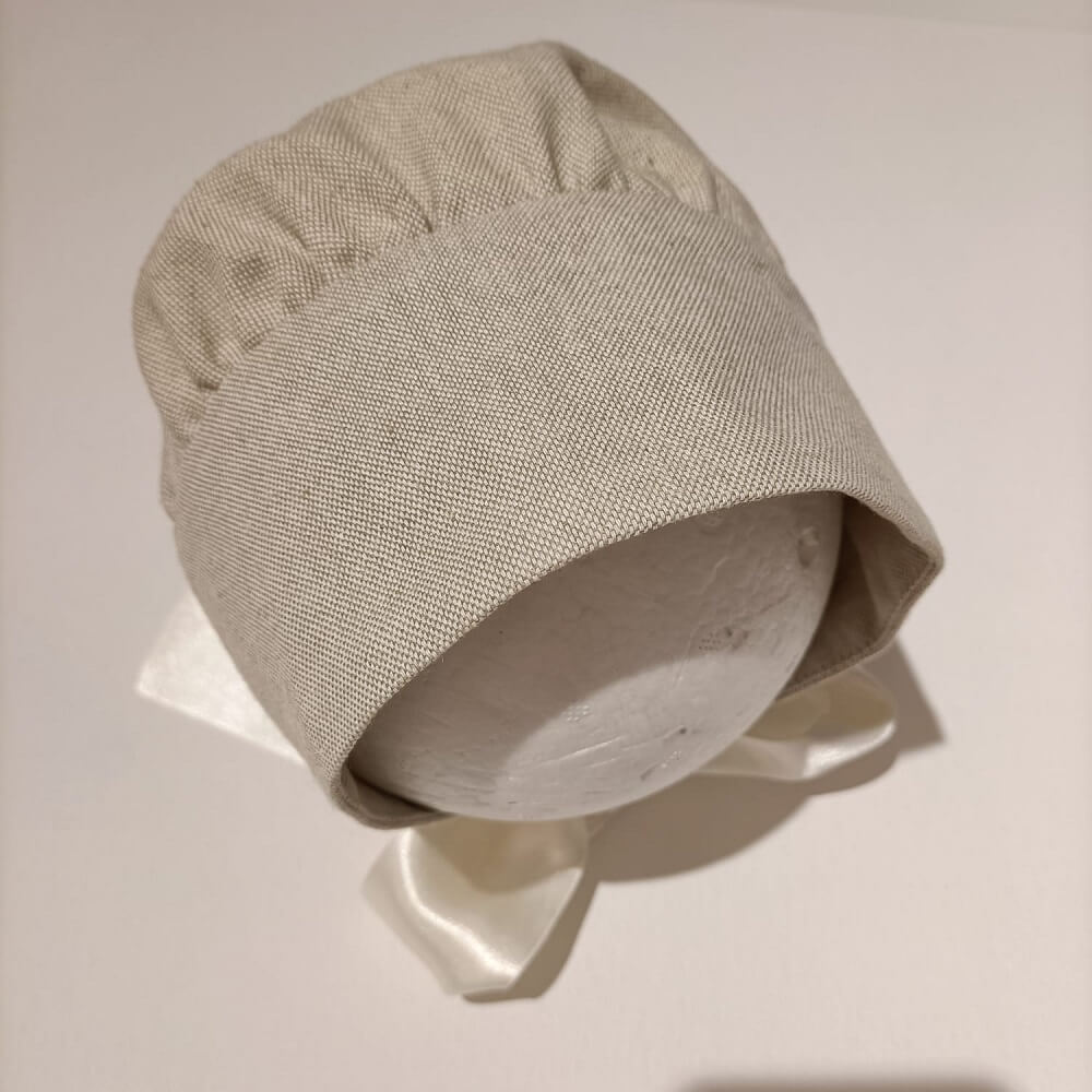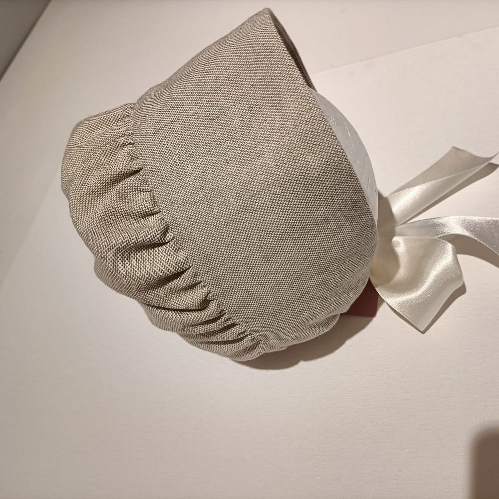 Touca Cerimónia confecionado em tecido 100% linho alentejano, com fita de cetim para laço no pescoço. O artigo que completa o look de cerimónia de qualquer bebé.