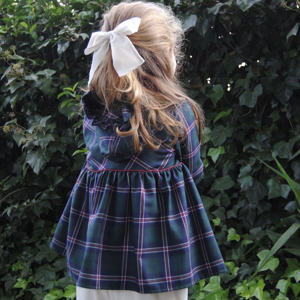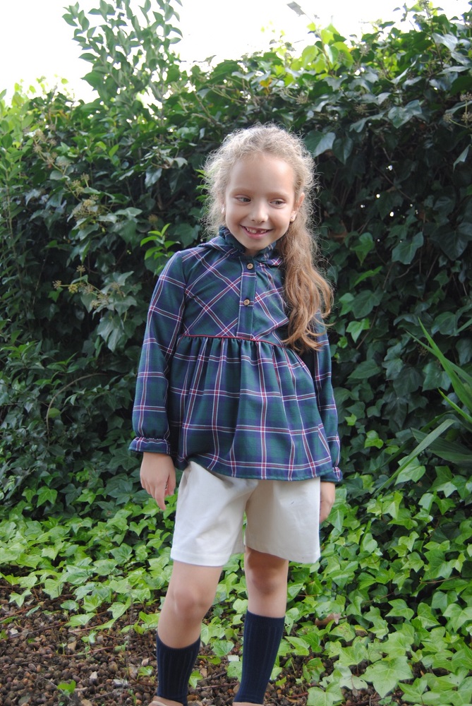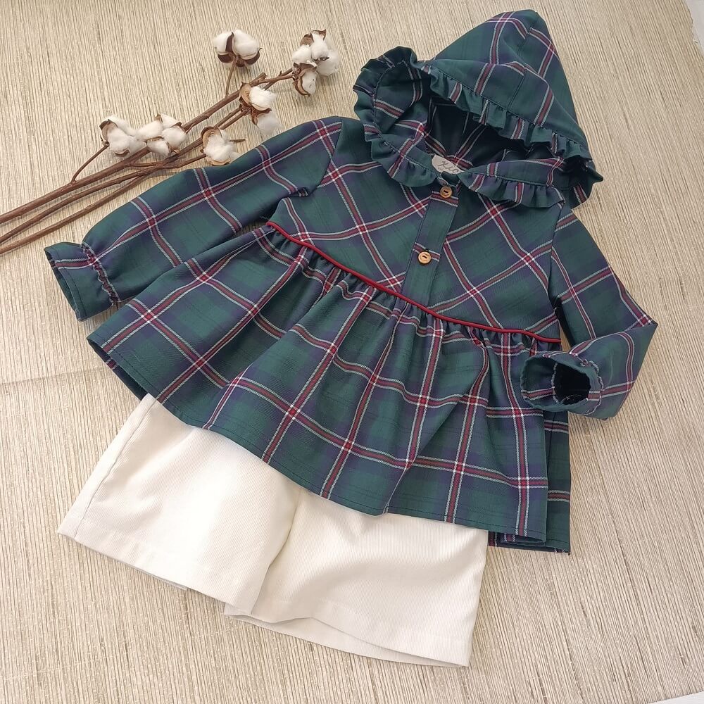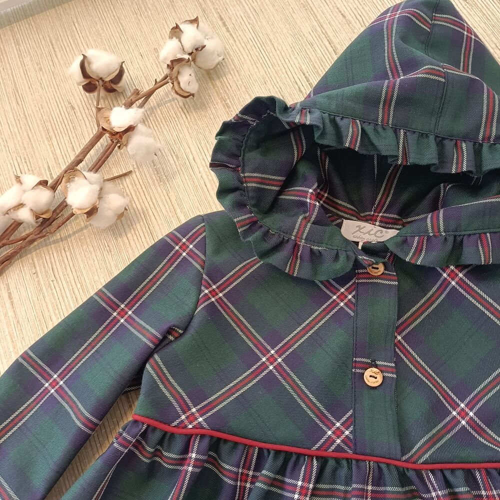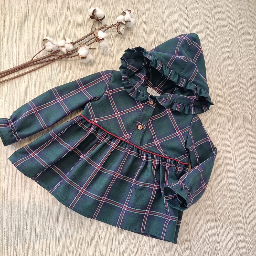 Túnica Maria Helena confecionado em tecido xadrez 100% algodão, manga comprida com elástico no punho, com ligeira abertura na parte da frente que fecha com botões de madeira e capuz com folho.