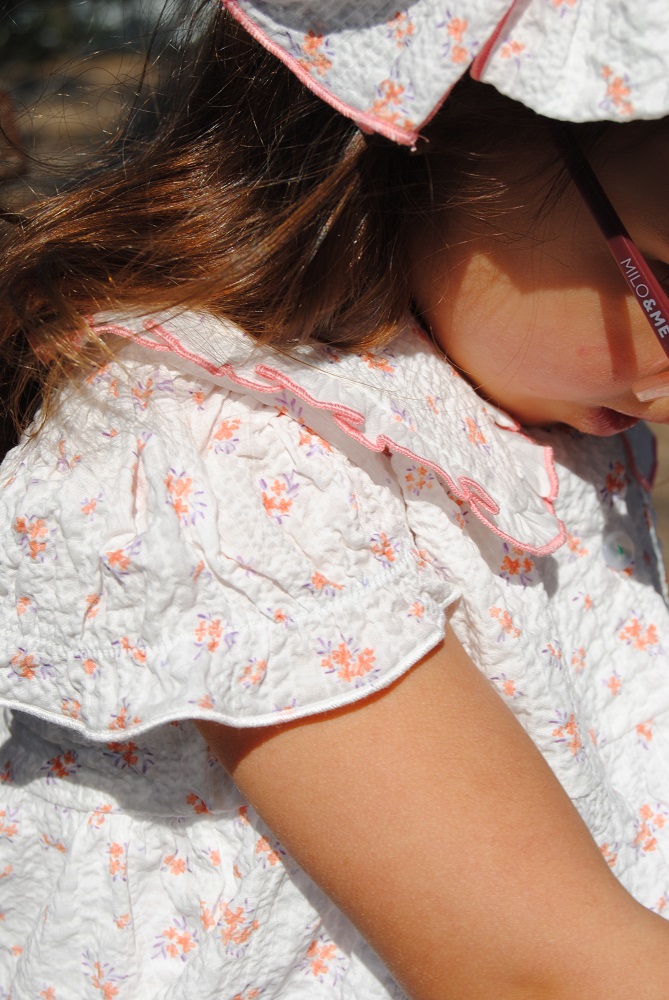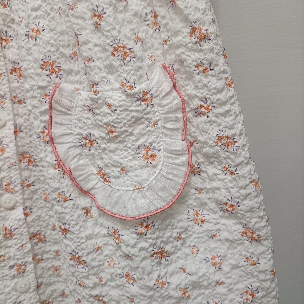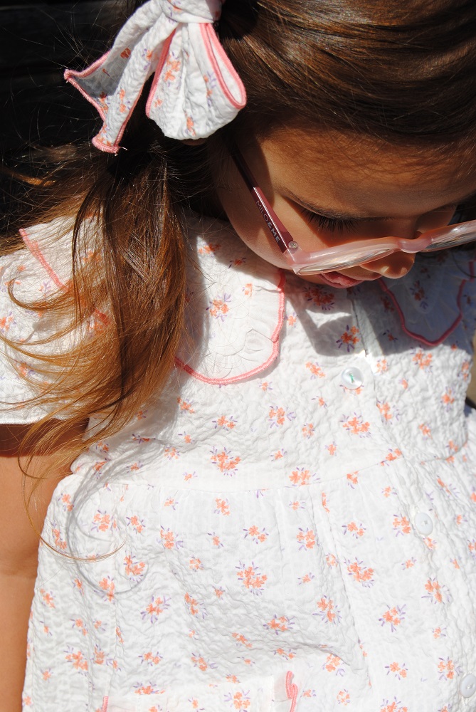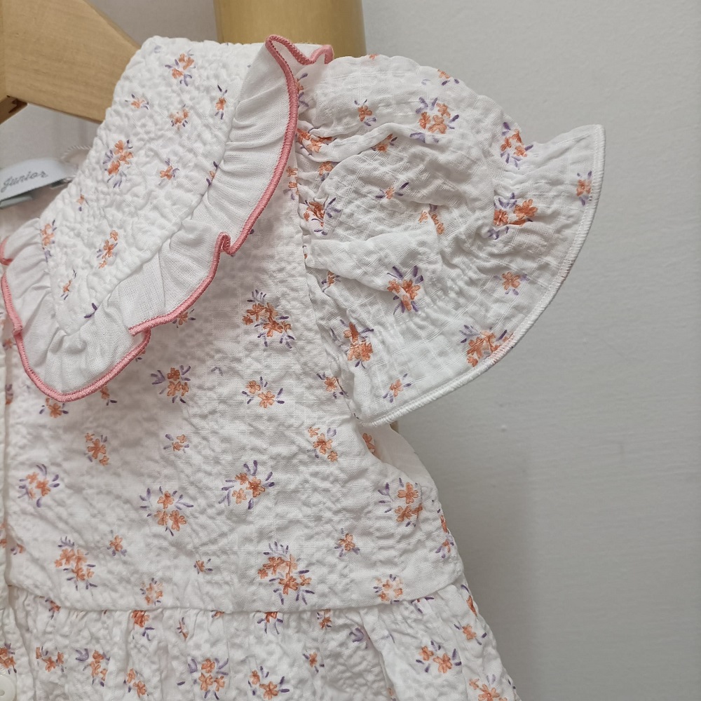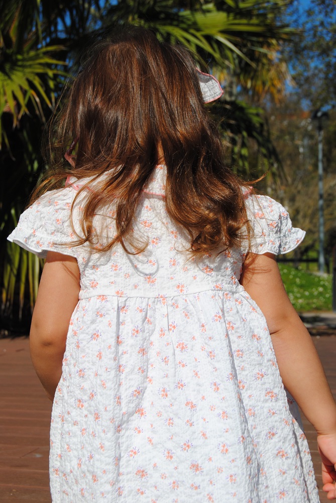 Vestido Lírio Lux da marca Lux Júnior produzido em Portugal e confecionado em tecido 100% algodão. Gola boneca com folho, dois bolsos na frente, aperta com botão à frente para facilitar o vestir/despir. A peça ideal para esta estação.